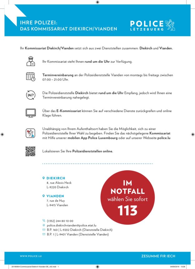 Ihr Kommissariat Diekirch/Vianden setzt sich aus zwei Dienststellen zusammen: Diekirch und Vianden.Ihr Kommissariat steht Ihnen rund um die Uhr zur Verfügung. Terminvereinbarung an der Polizeidienststelle Vianden von montags bis freitags zwischen 07:00 – 21:00 Uhr. Die Polizeidienststelle Diekirch bietet rund um die Uhr Empfang, jedoch wird Ihnen eine Terminvereinbarung nahegelegt. Über das E-Kommissariat können Sie…
